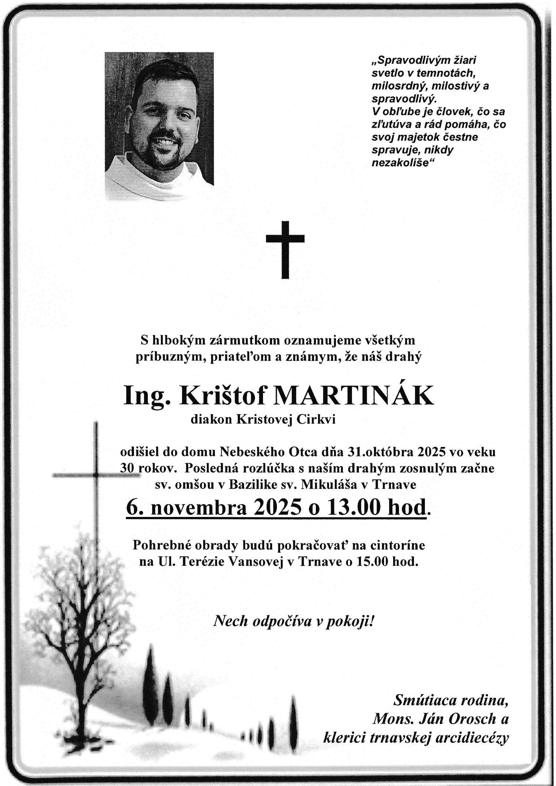 S bolesťou v srdci, ale s nádejou vo večný život odovzdávame nášho brata Krištofa do rúk nebeského Otca.
